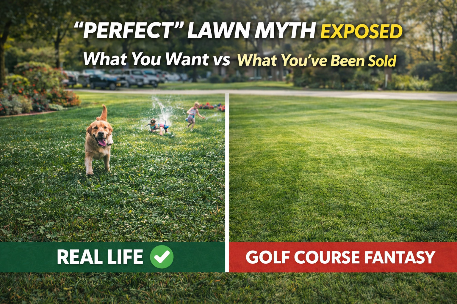 Somewhere between HOA pressure, marketing, and the golf-course fantasy, “perfect” became a single standard of flawless green, uniform texture, zero weeds, and stripes on command. The problem is that the standard shared is designed for appearances, not for real-world use